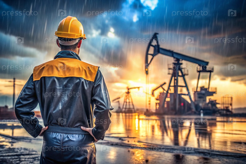 Добыча нефти. Нефтяные скважины и человек в рабочей одежде и строительном шлеме. Нефтяная платформа и промышленное оборудование. Тяжелые условия труда