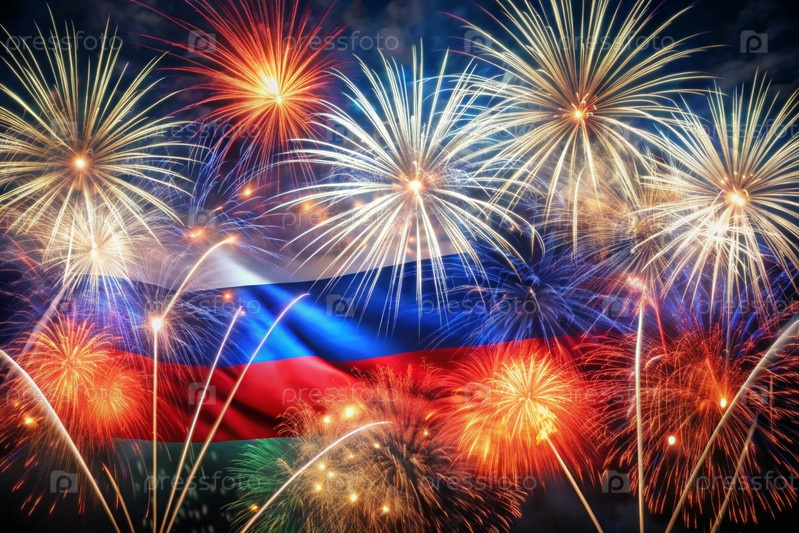 Россия. Москва. Национальный флаг Российской Федерации на фоне фейерверков. Русский триколор. День России отмечается 12 июня