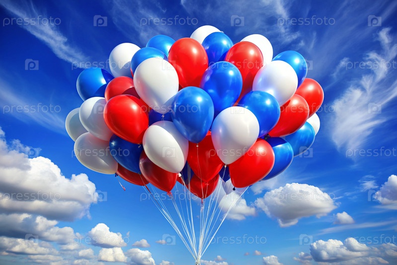 Концепция празднования Дня России 12 июня.Балоны в цветах триколора России.Белый, синий, красный летают по голубому небу