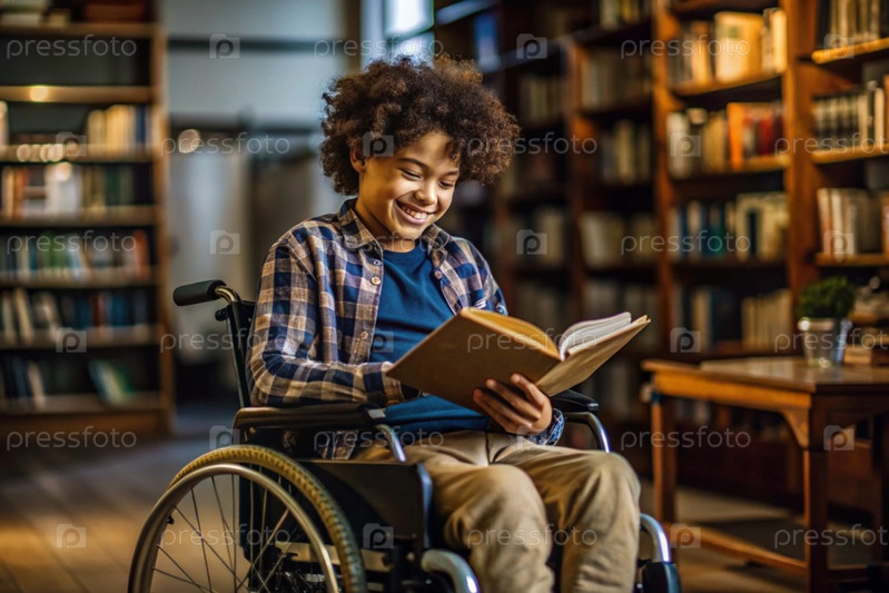 Инвалидность.Ребенок с инвалидностью в коляске читает книгу в библиотеке.Здоровье и медицина