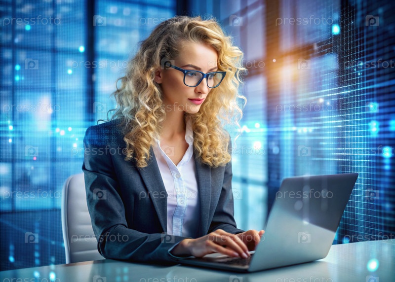 Красивая молодая женщина в костюме работает на ноутбуке в офисе с цифровыми кодами на виртуальном экране Цифровые технологии будущего Разработка программного обеспечения