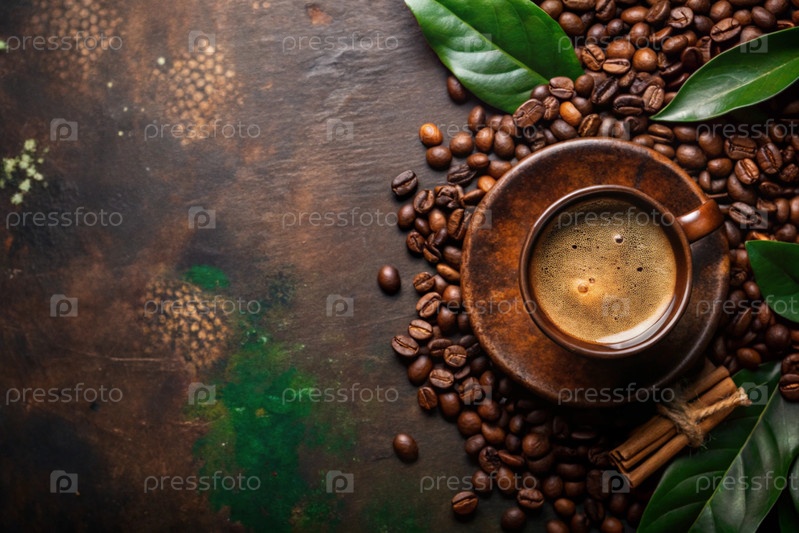 Чашка освежающего черного кофе и кофейных зерен на старом зеленом столе