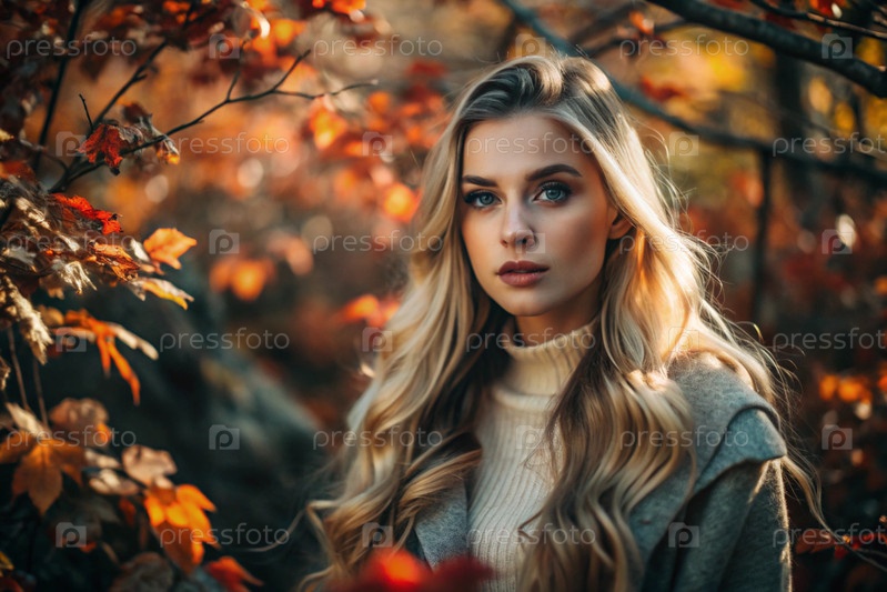 Осенний портрет. Близкий план молодой блондинки с выразительными глазами в вязанном свитере. Красивая девушка в осенних листьях