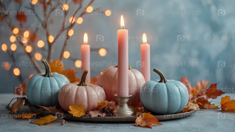 Пастельный розовый и синий тыквенные цвета, светло-синие и розовые свечи и осенние листья на светлом фоне