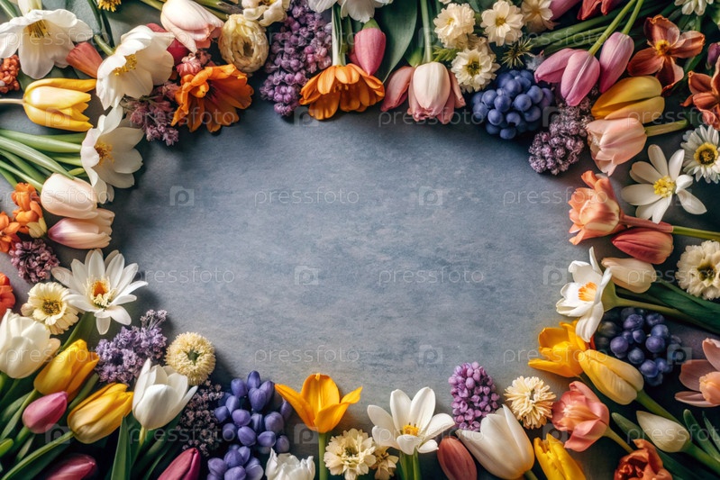 Красивый цветочный фон. Рама весенних цветков с тюльпанами, нарциссами, крокусами, гиацинтами. Вид сверху. Пространство для текста