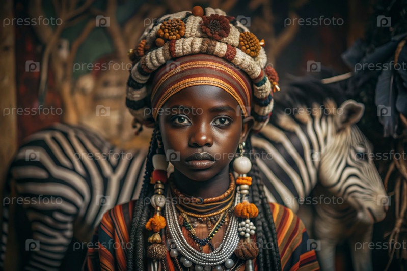 Красивая африканская девушка в традиционном национальном костюме против зебры портрет символизирует традиции и красоту африканского народа