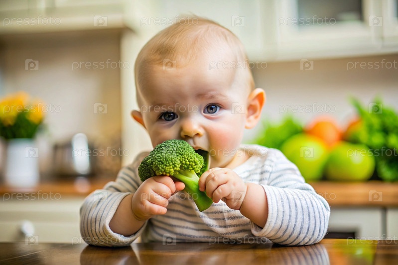 Здоровое детское питание. Первая еда. Кормить ребенка. Милый ребенок ест брокколи. Свежие овощи и фрукты
