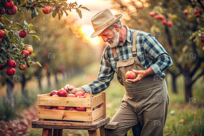 Сельскохозяйственная промышленность. Деревянный ящик с яблоками в руках фермера-мужчины. Садовник собирает богатый урожай. Ближе, солнечный свет. Осенний плодовый сбор