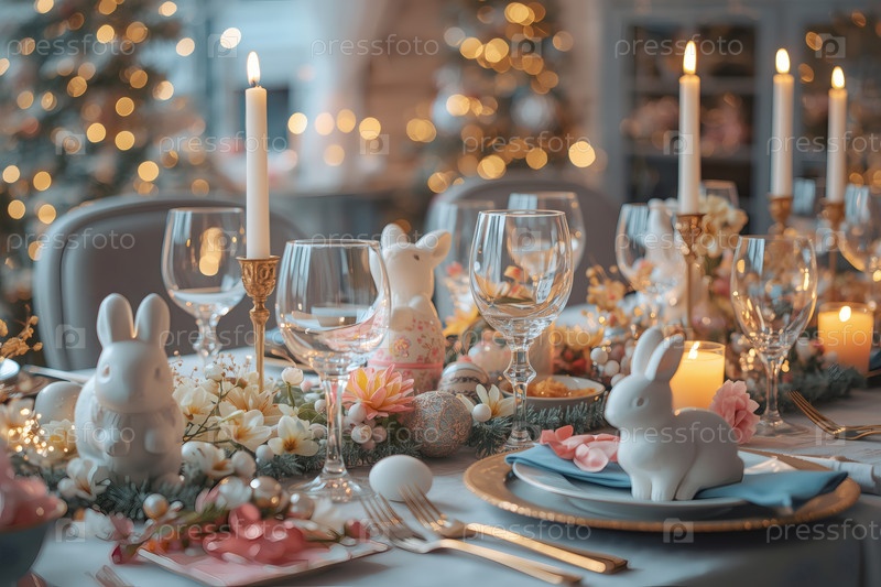 Пасхальный баннер 2026. декоративная тарелка, столовая посуда, стаканы, пасхальные яйца и кролики. концепция празднования Пасхи для кафе и ресторанов