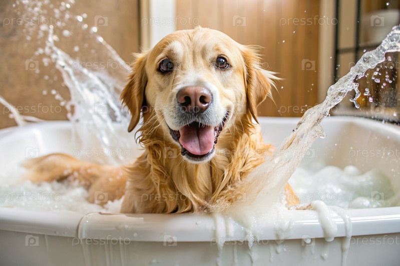Золотой ретривер купается в пузырьковой ванне. Помыть собаку. Концепция ухода за домашними животными