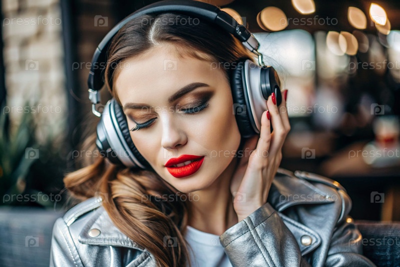 Молодая красивая гламурная девушка с большими наушниками и ярко-красной помадой, слушающая музыку на ушах