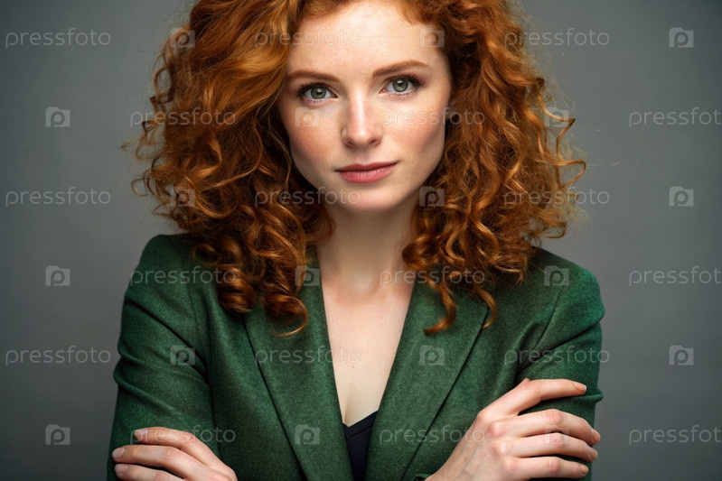 Бизнес-леди с локоночными красными волосами и веснушками на лице.Она одета в непринужденный темно-зеленый блейзер и куртку.Руки пересекли его грудь, глядя прямо в камеру