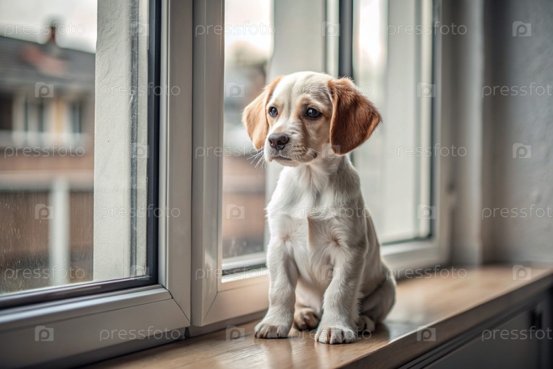 Маленький щеночек смотрит в окно и ждет своего хозяина