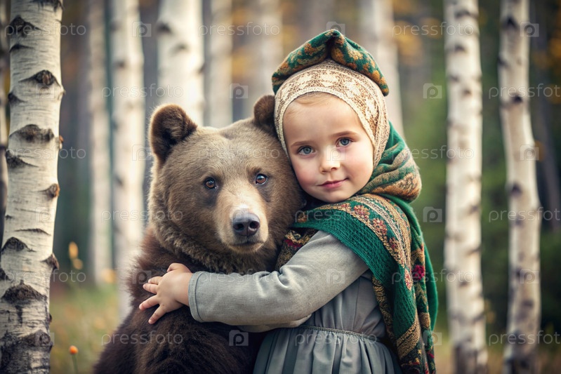 Красивая маленькая девочка в русской народной одежде и с платками на голове в березовой роще с живым медведем Русский фольклор, славянская мифология
