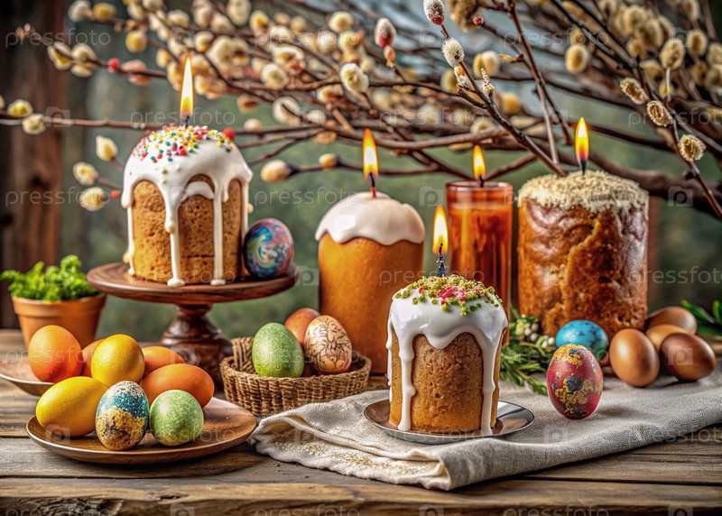 Православный Пасхальный торт, окрашенные яйца, иконы, лица святых, цветы, церковные свечи и пасхальное украшение на деревянном столе в старом деревенском доме