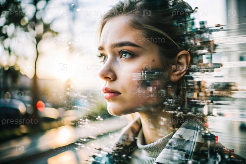 Портрет молодой женщины.Концептуальное искусство Клубовое изображение на фоне города с двойной экспозицией и визуальными эффектами