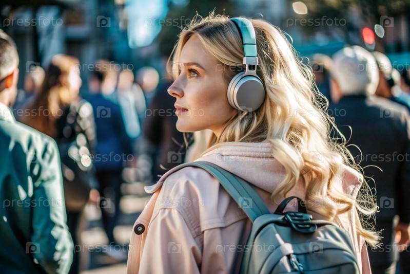 Музыкальный любитель. молодая красивая кудрявая женщина с рюкзаком на фоне улицы и людей. Турист слушает музыку в наушниках и гуляет по городу