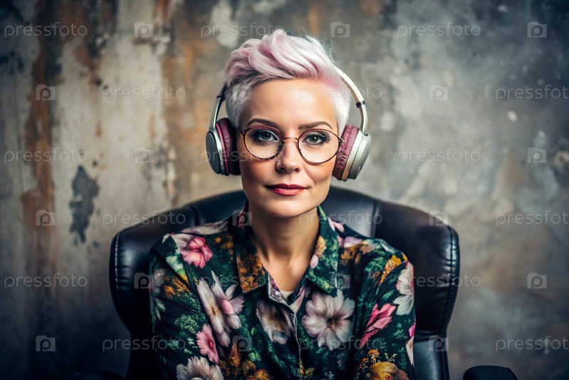 Молодая красивая девушка с розовыми волосами слушает музыку в больших беспроводных наушниках дома, на стуле в гостиной