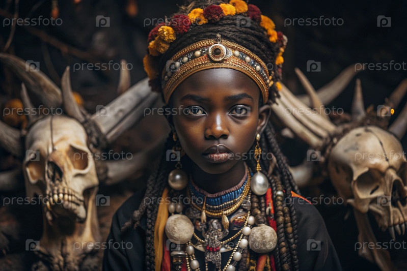 Красивая африканская девушка в традиционном национальном костюме. с костями. портрет символизирует традиции, культуру и красоту африканского народа