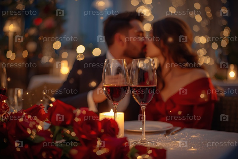 Концепция Дня святого Валентина: элегантная пара, целующаяся на романтическом ужине при свечах с бокалами вина в роскошный вечер