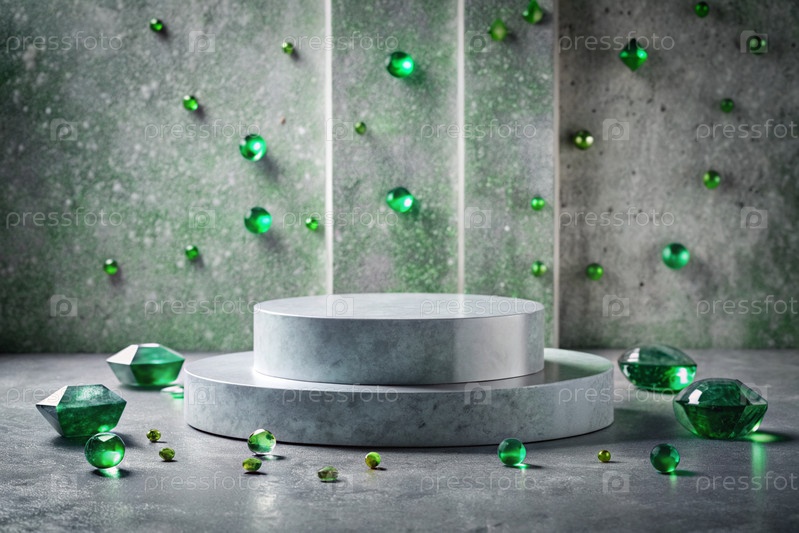 Минималистский фон для демонстрации ювелирных изделий. Современная пустая трибуна с серой стеной и изумрудами. Креативный дизайн презентации продукта