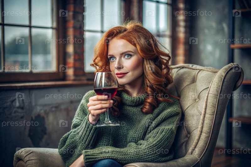 Современная, стильная, красивая женщина с рыжими волосами и бокалом красного вина на стуле в гостиной дома