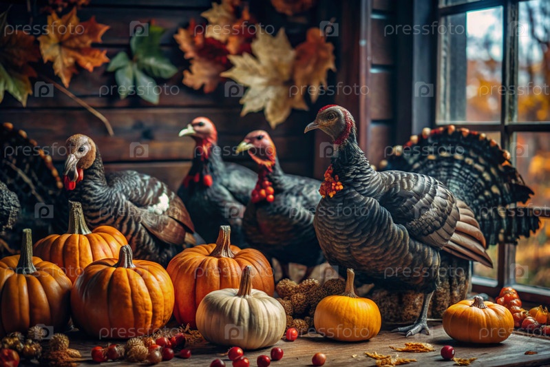 Осенний фон красочные тыквы, ягоды и домашние индейки на деревянном столе. Концепция Дня благодарения