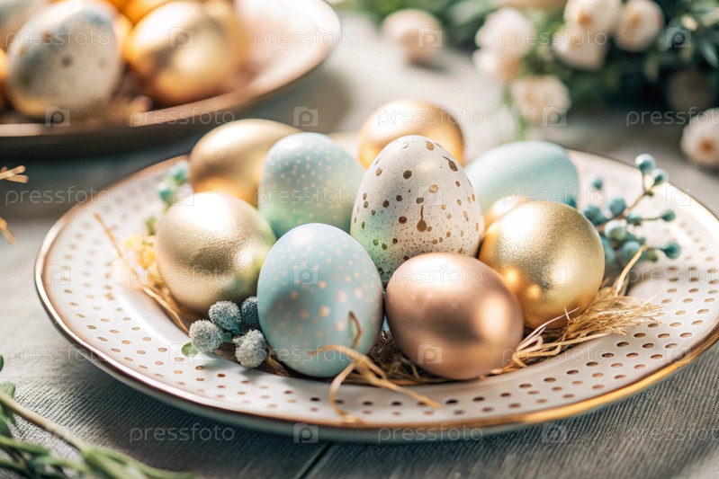 Пасхальный баннер. Настройка стола. Роскошная тарелка, пасхальные яйца с позолоченными красками. Концепция праздника Пасхи для кафе и ресторанов