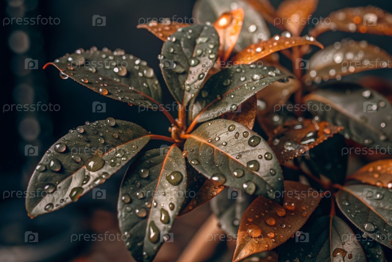 Макрографический крупный план красно-зеленых листьев, капли воды на листьях