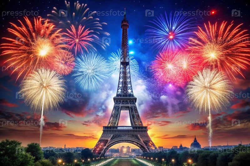 14 июля - Национальный день Франции. Государственный флаг Франции против Эйфелевой башни. Фейерверк, фейерверк против ночного неба. Триколор