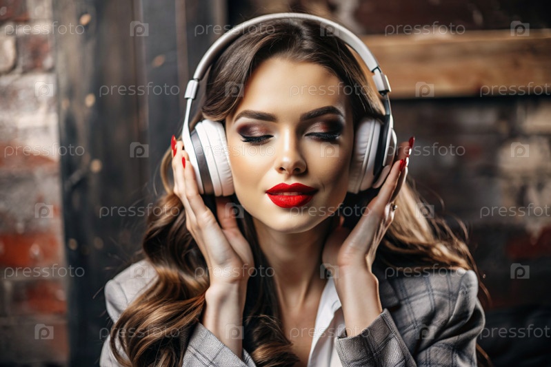 Молодая красивая гламурная девушка с большими наушниками и ярко-красной помадой, слушающая музыку на ушах