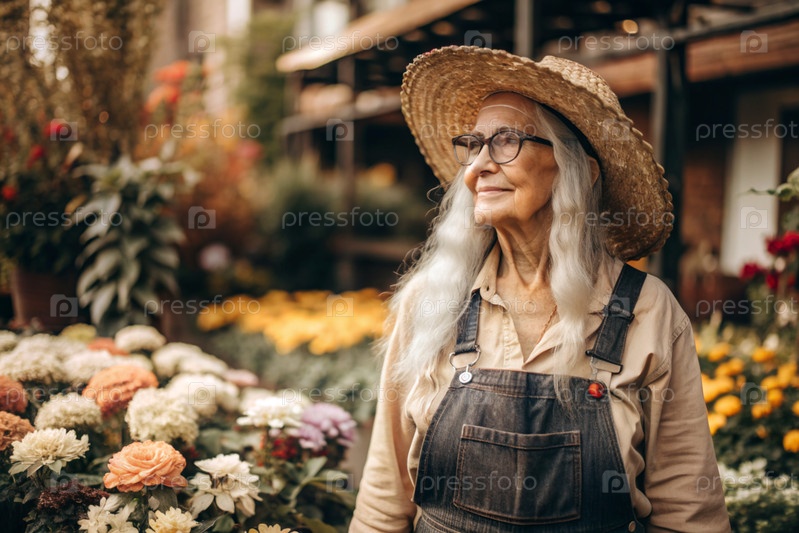 Пожилой садовник с седыми волосами в комбинезоне в уютной цветочной теплице