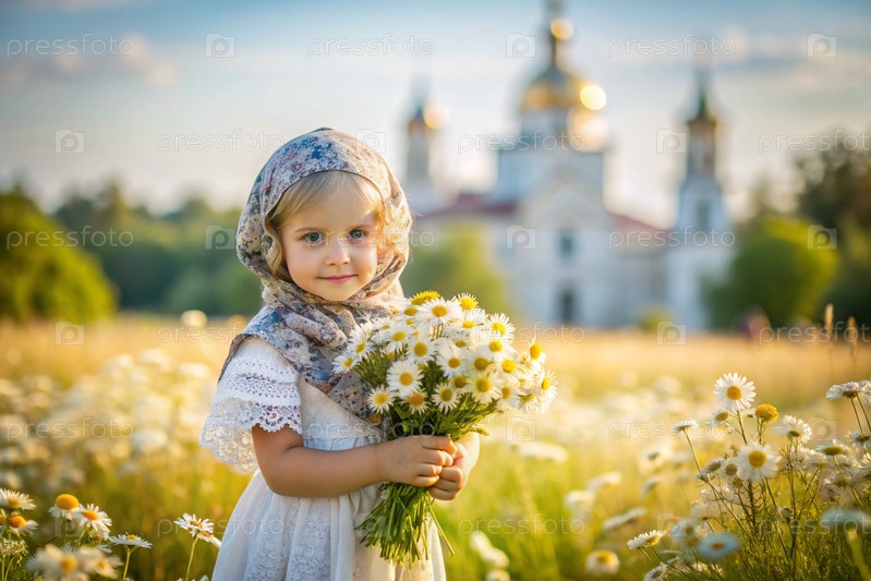 Всероссийский день семьи, любви, верности. красивая маленькая кудрявая девочка в русском шале с букетом ромашки на фоне православной церкви. День святого Валентина Петра и Февронии
