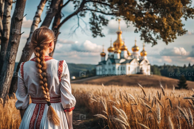 Девушка в традиционном русском льняном наряде и с сковородой на голове на поле спелой золотистой пшеницы на фоне березы и православной церкви