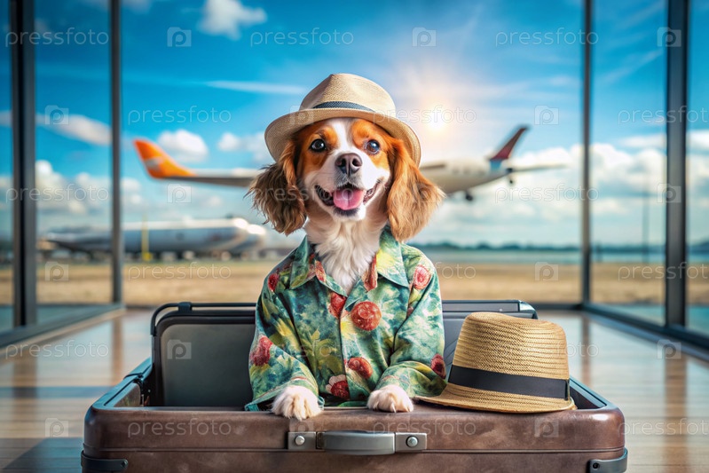 Стильный щенок в путешествии, очаровательная забавная собака в гавайской рубашке и шляпе, сидящая в открытом чемодане