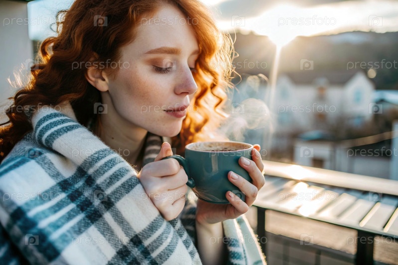 Красивая рыжеволосая женщина, завернутая в клетку с кружкой горячего кофе на красивом террасе под лучами заходящего солнца