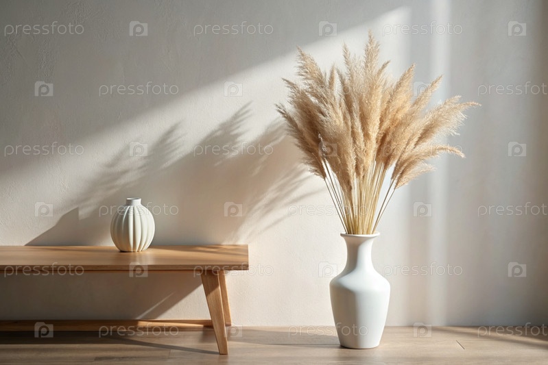 Современная белая керамическая ваза с сухой травой на деревянном столе Скандинавский интерьер Пустая белая стена со тенью из окна