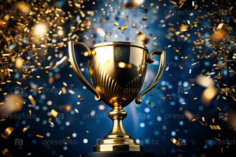 Вознаграждение. Золотая чаша и летающие конфетти на темно-синем фоне. Спортивные соревнования, успех, бизнес, концепция достижения и победы