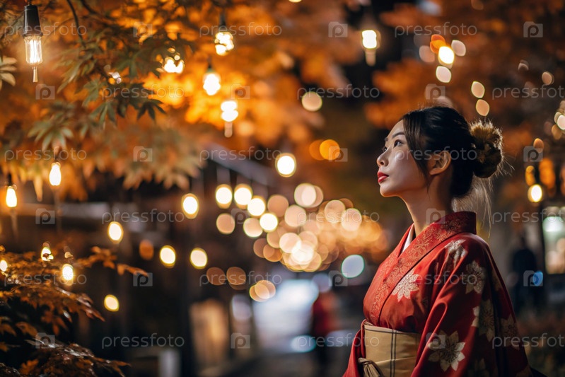 Японская девушка в традиционном национальном костюме - кимоно. На сказочном фоне фонарики и осенние деревья. Портрет символизирует традиции и культуру народа Японии