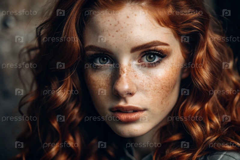 Глубокий эмоциональный портрет.Лицо молодой девушки без макияжа, с выразительными глазами, кудрявыми красными волосами и веснушками на лице. Естественная женская красота