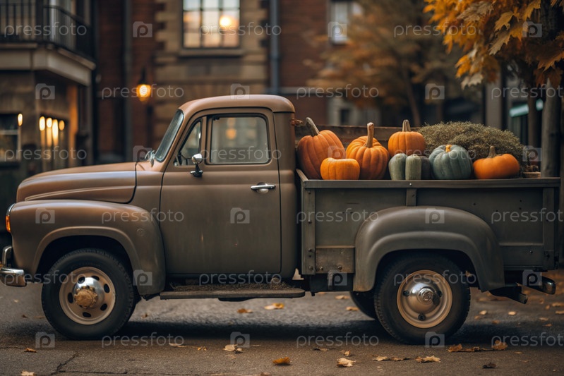 Осень, осенний дизайн.Большой урожай тыквы на заднем сиденье ретро-пикапа, крупный план