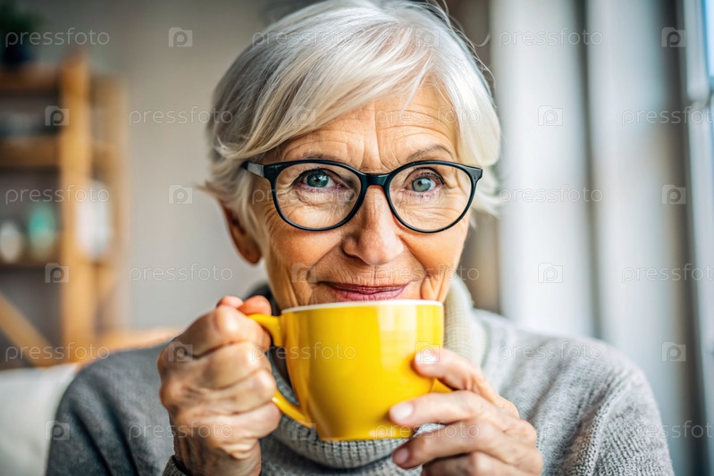 Пожилая пенсионерка, современная бабушка в очках, пьет кофе из кружки во внутренней части гостиной, сидя на стуле дома под естественным светом