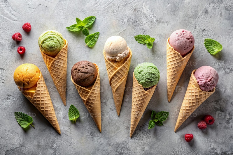 сладкий десерт. морозильные шишки с различными вкусами на бетонном сером фоне. Всемирный день мороженого