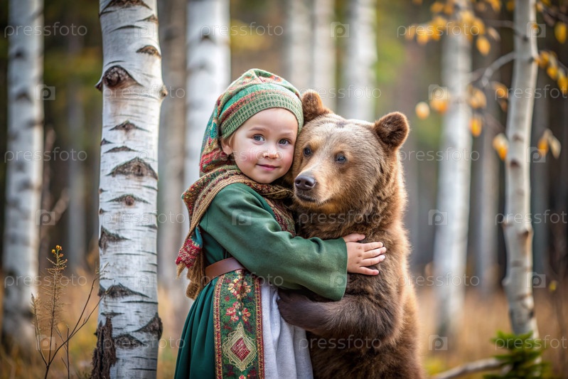 Красивая маленькая девочка в русской народной одежде и с платками на голове в березовой роще с живым медведем Русский фольклор, славянская мифология
