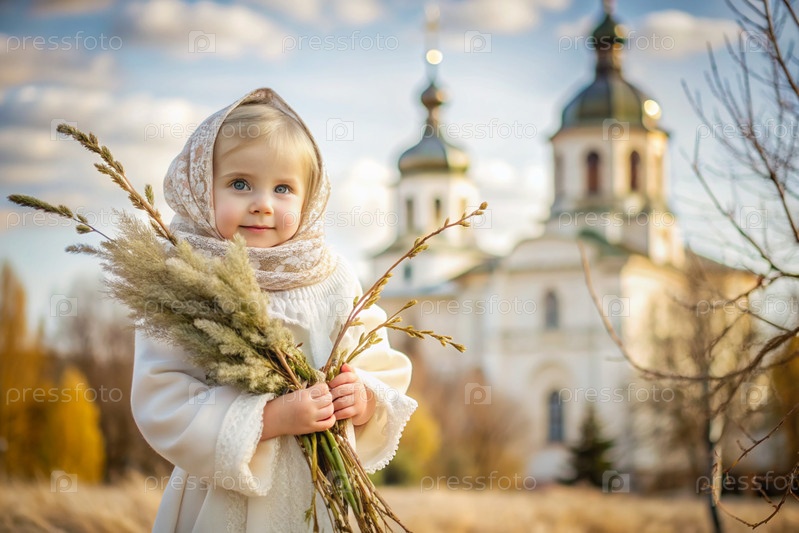 Портрет трехлетней девочки в русском народном шале с букетом дикой травы в руках на фоне православной церкви