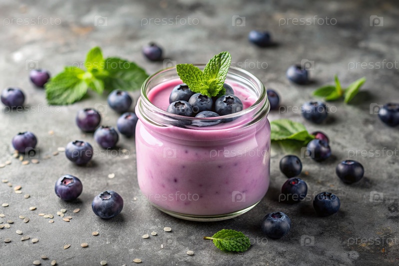 Домашнее голубиное йогурт со свежими чернилами, винтажная ложка и полотенце на стильном сером фоне