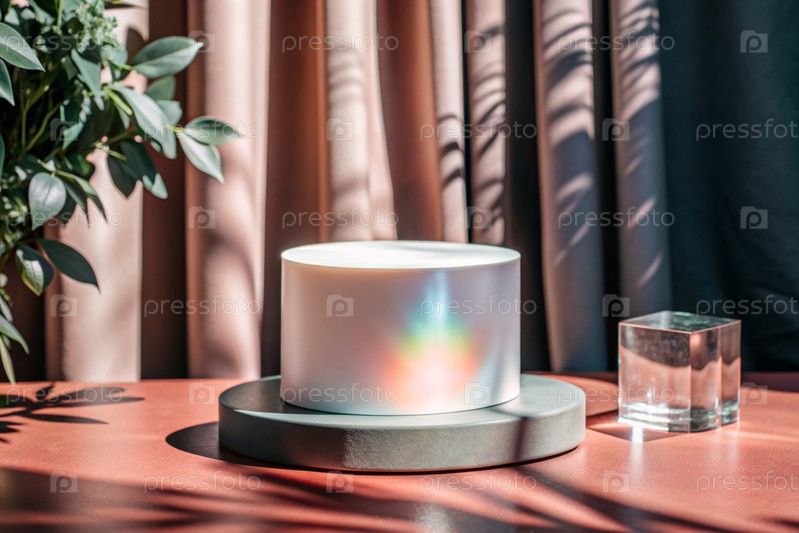 Пустой цилиндрический подиум со сверкающими кристаллами при преломлении света на минималистическом фоне, стенд для демонстрации моделей косметики и товаров