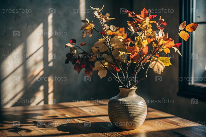 Ветви с золотыми осенними листьями в керамической вазе на деревянном столе у окна. Концепция домашнего комфорта. Осенний декор для Хэллоуина