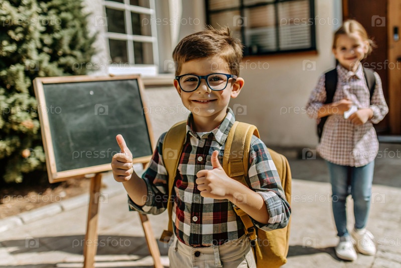Мальчик с очками показывает класс своей рукой. Ребенок впервые идет в школу. Ребёнок со школьной сумкой и книгой. Ребёнок в классе с доской на заднем плане. Возвращение к школе