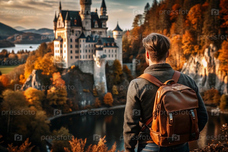 Мужчина-путешественник с рюкзаком на фоне огромного замка в осеннем лесу в горах. он путешествует и наслаждается жизнью и окружающей средой. туризм